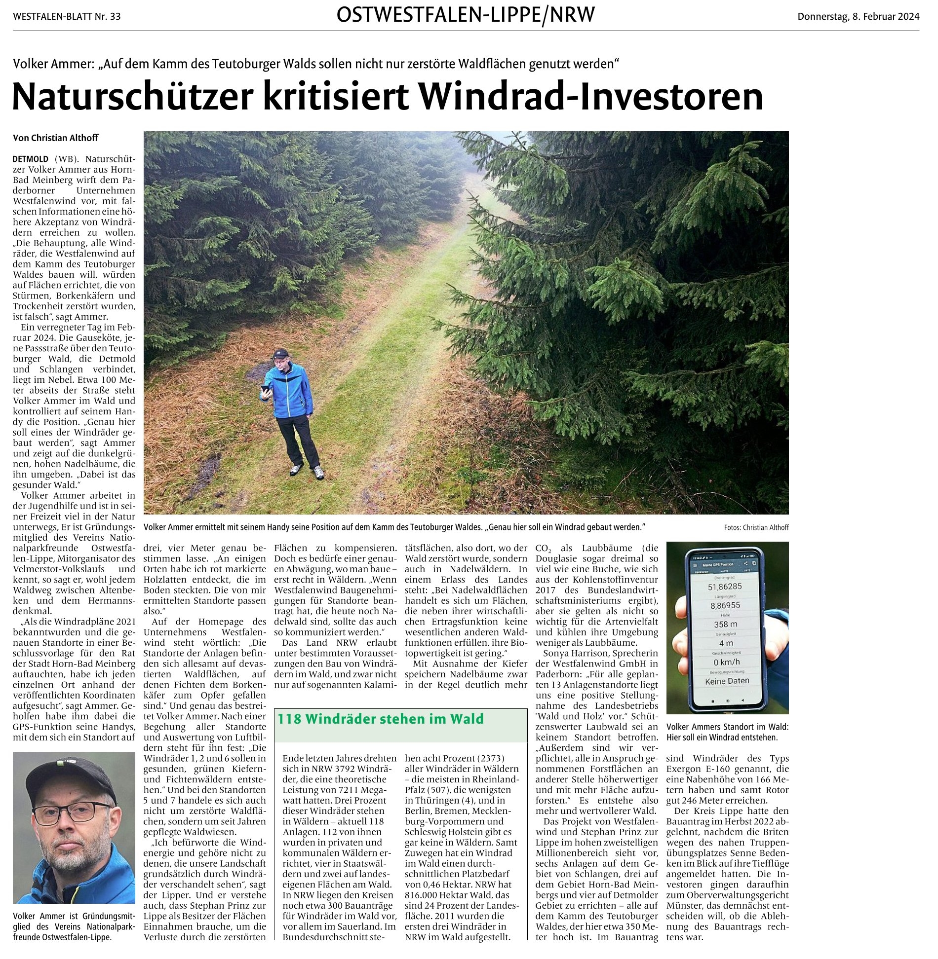 Unter dem Titel "Naturschützer kritisiert Windkraft-Investoren" berichtet das Westfalenblatt in seiner Ausgabe vom 8. Februar 2024 ausführlich über die Kritik von Volker Ammer (Naturschützer und Mitglied DIE LINKE Stadtverband Horn-Bad Meinberg) an den Windradplänen von Stephan Prinz zur Lippe und Investor Westfalenwind auf dem Teutoburger Wald. Anlass ist ein in Kürze zu erwartendes Gerichtsurteil zu den 13 dort geplanten Anlagen.