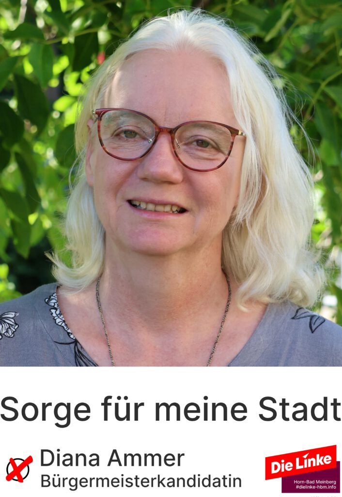 Mein Name ist Diana Ammer und mit der Erfahrung von über 15 Jahren Ratsarbeit kandidiere ich für die Partei Die Linke für das Amt der Bürgermeisterin in meiner Heimatstadt.